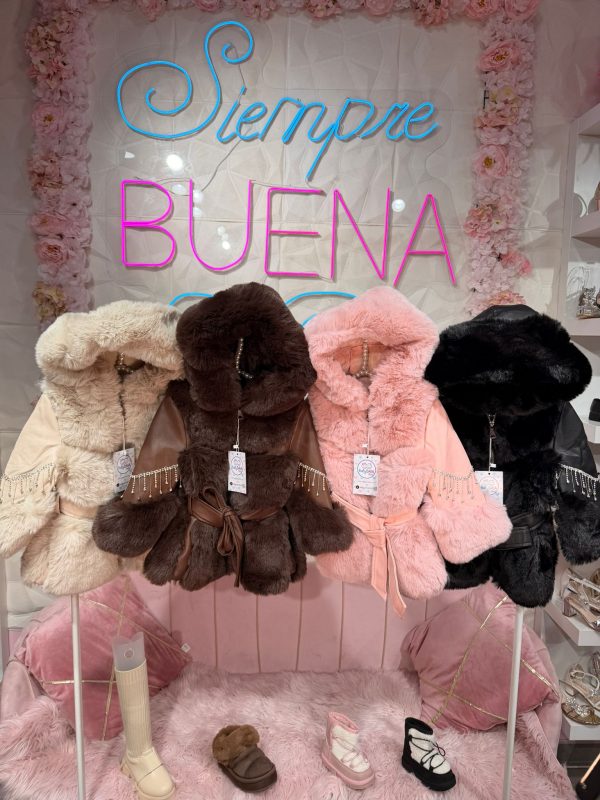 Abrigo forrado el interior de pelo, con bolsillos, cinturón ajustable y brillos en los brazos. Tallas completas.