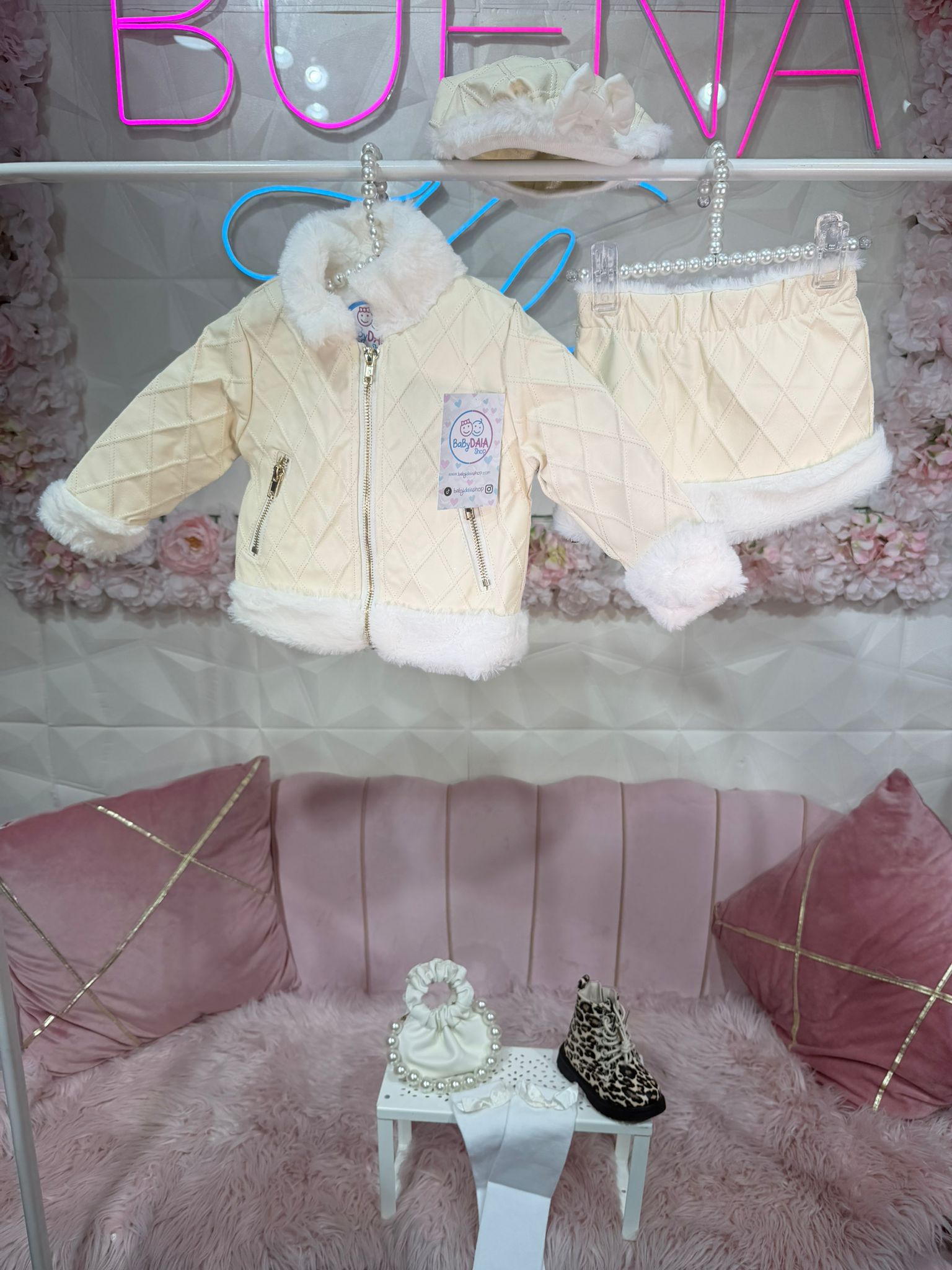 Precioso conjunto que incluye 4 piezas, calcetines, falda, chaqueta y boina.