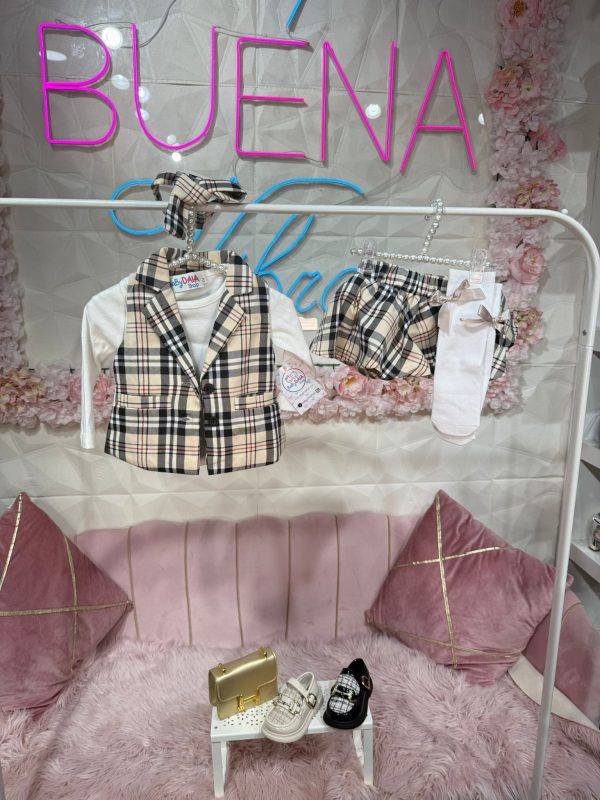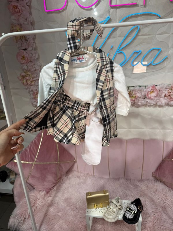 CONJUNTO COMPUESTO POR CHALECO, JERSEY BASICO, FALDA, LAZO Y CALCETINES ALTOS.