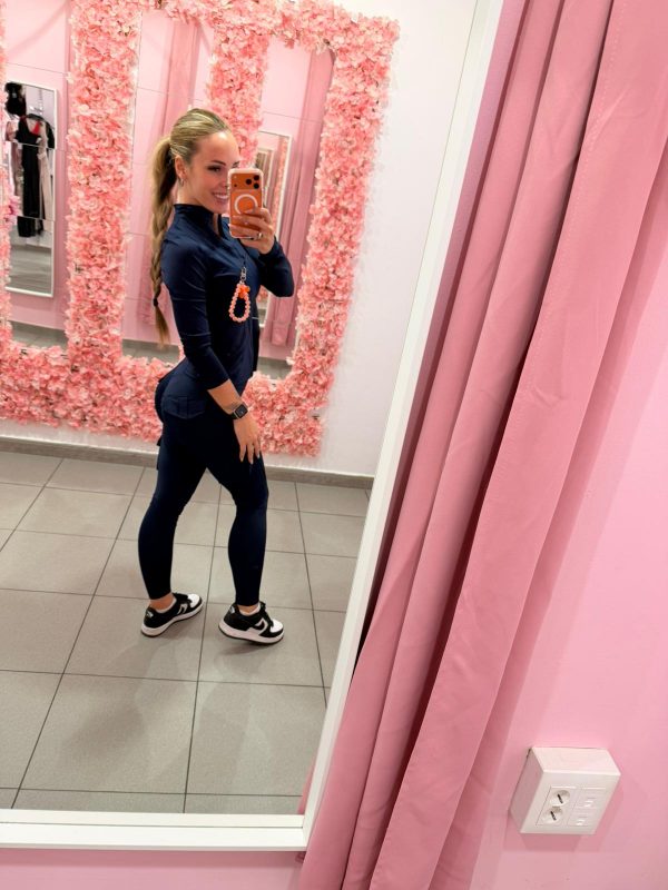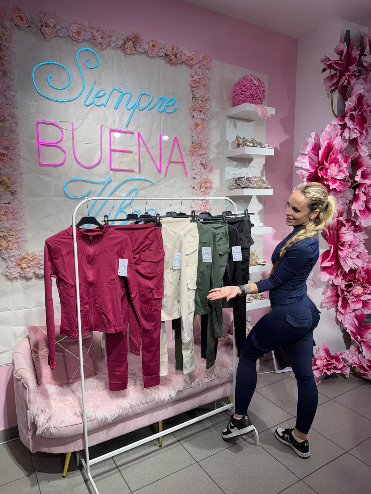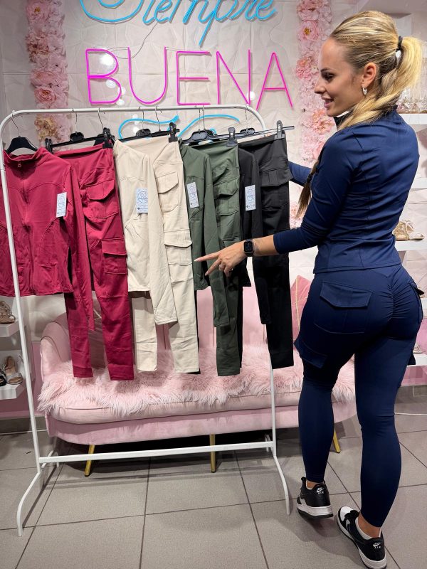 Conjunto compuesto por sudadera con cremallera y legging cargo push-up de licra con tiro alto.