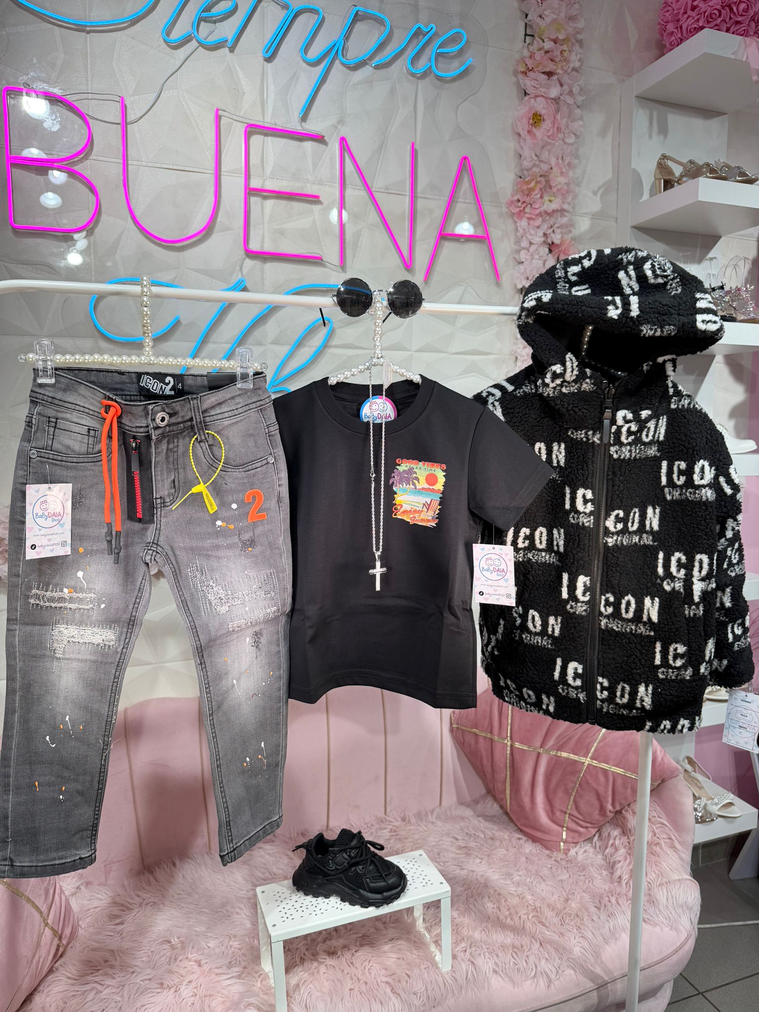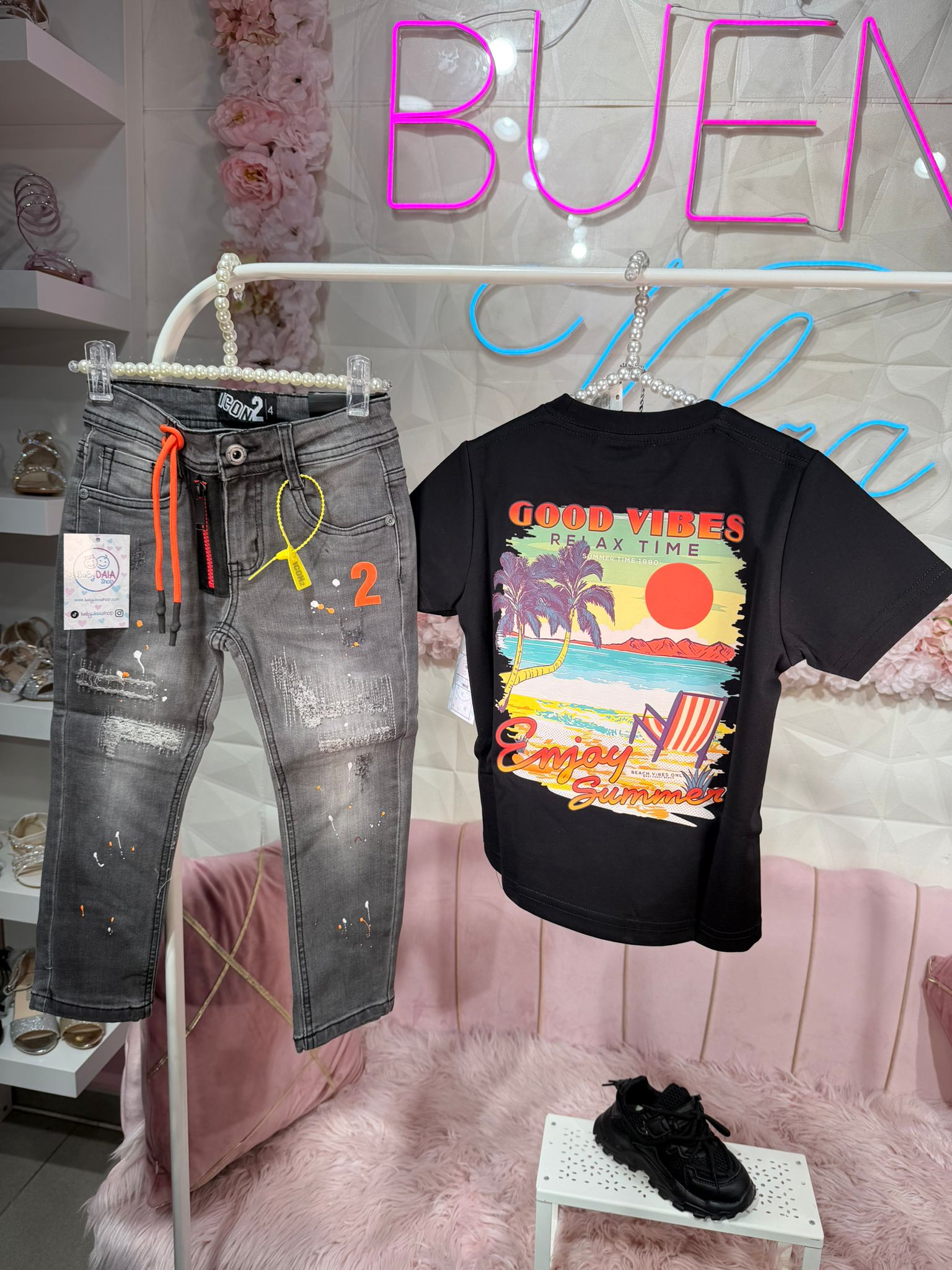 Conjunto compuesto por vaquero con cintura engomada y camiseta.