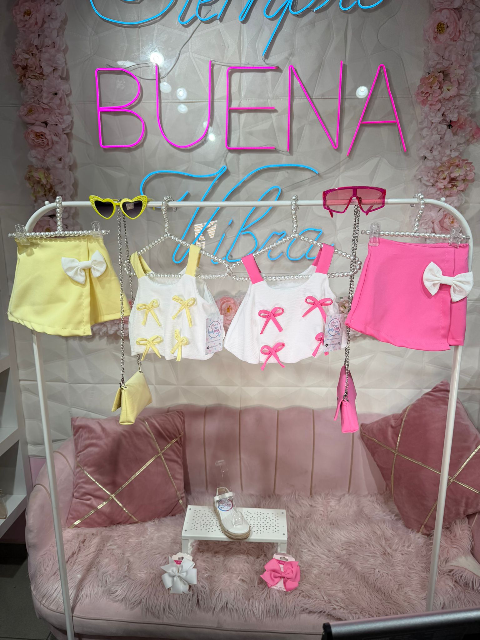 Conjunto compuesto por top de lazos + falda / pantalon con cintura engomada y bolso.