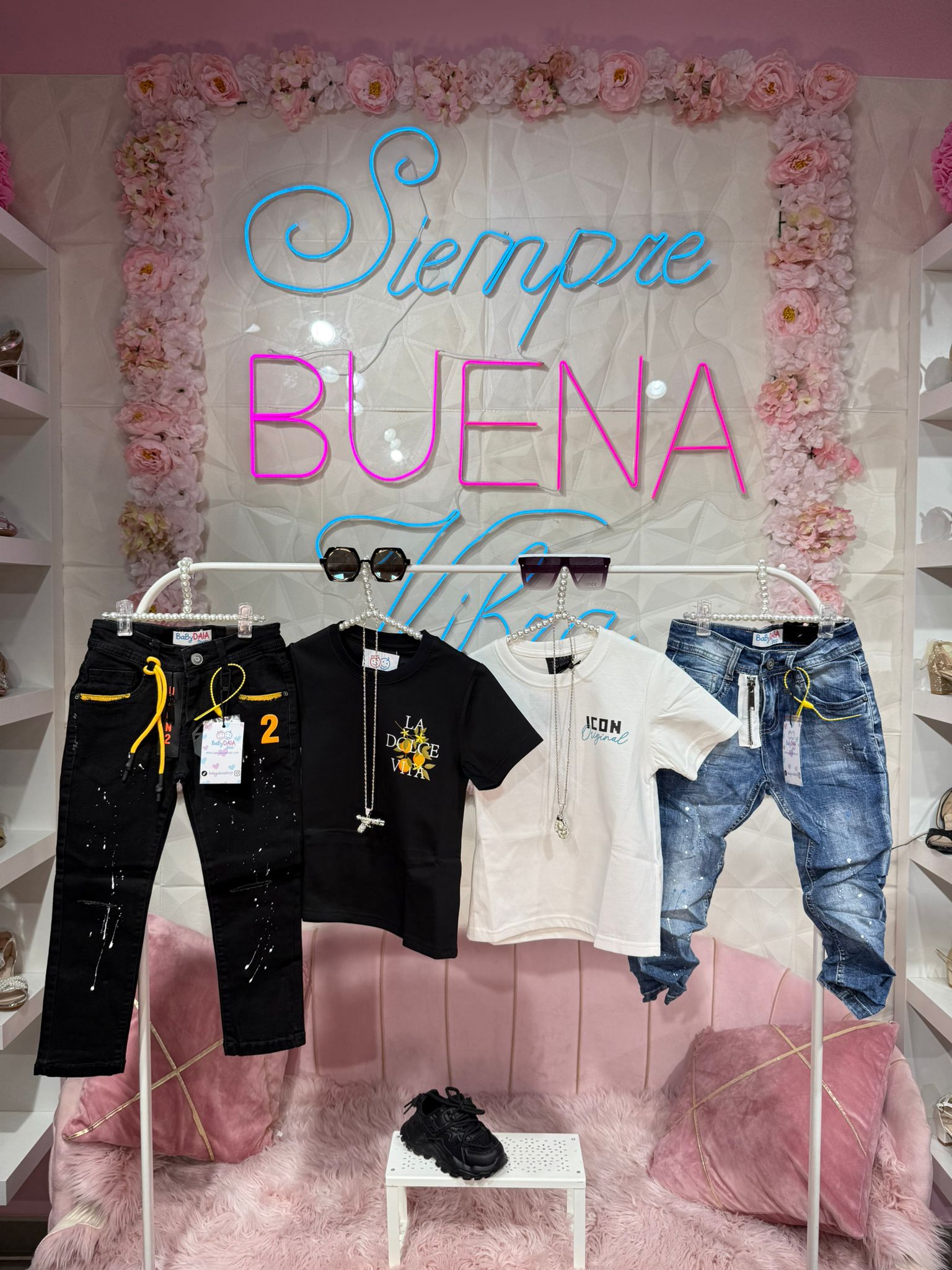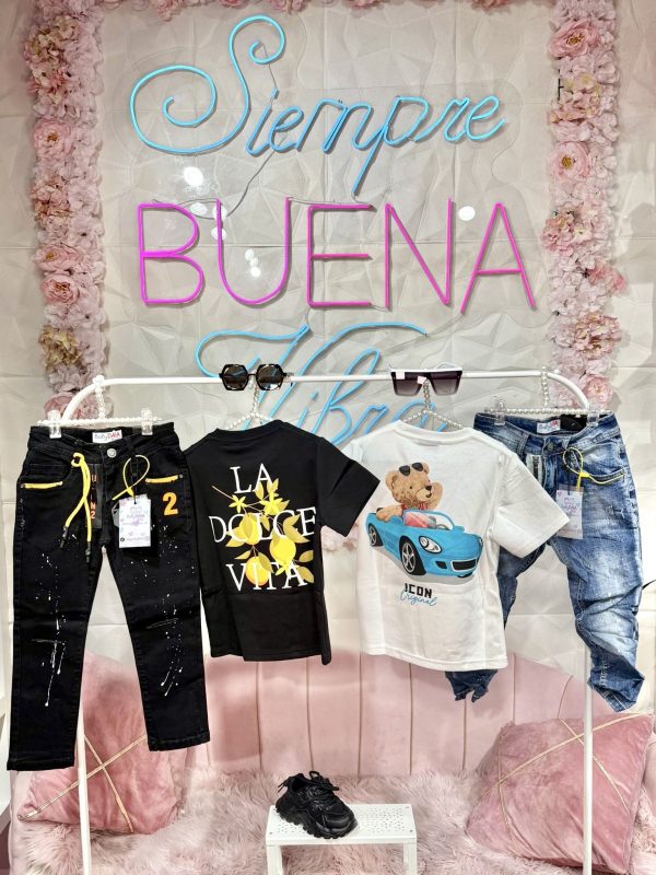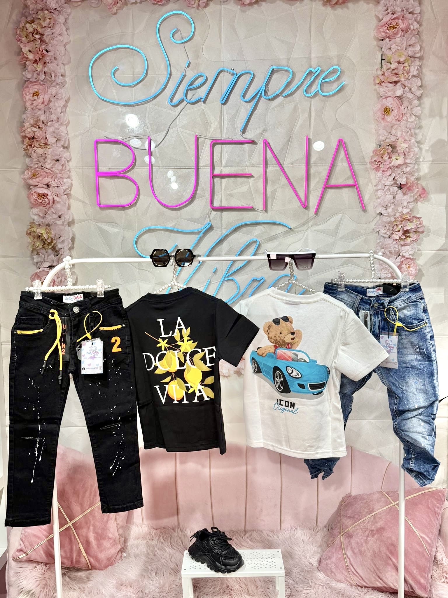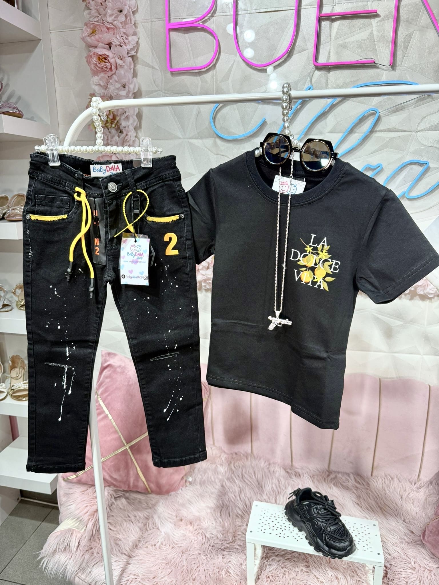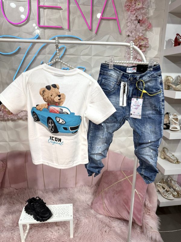 Conjunto compuesto por pantalon vaquero con cintura engomada ajustable y camiseta.