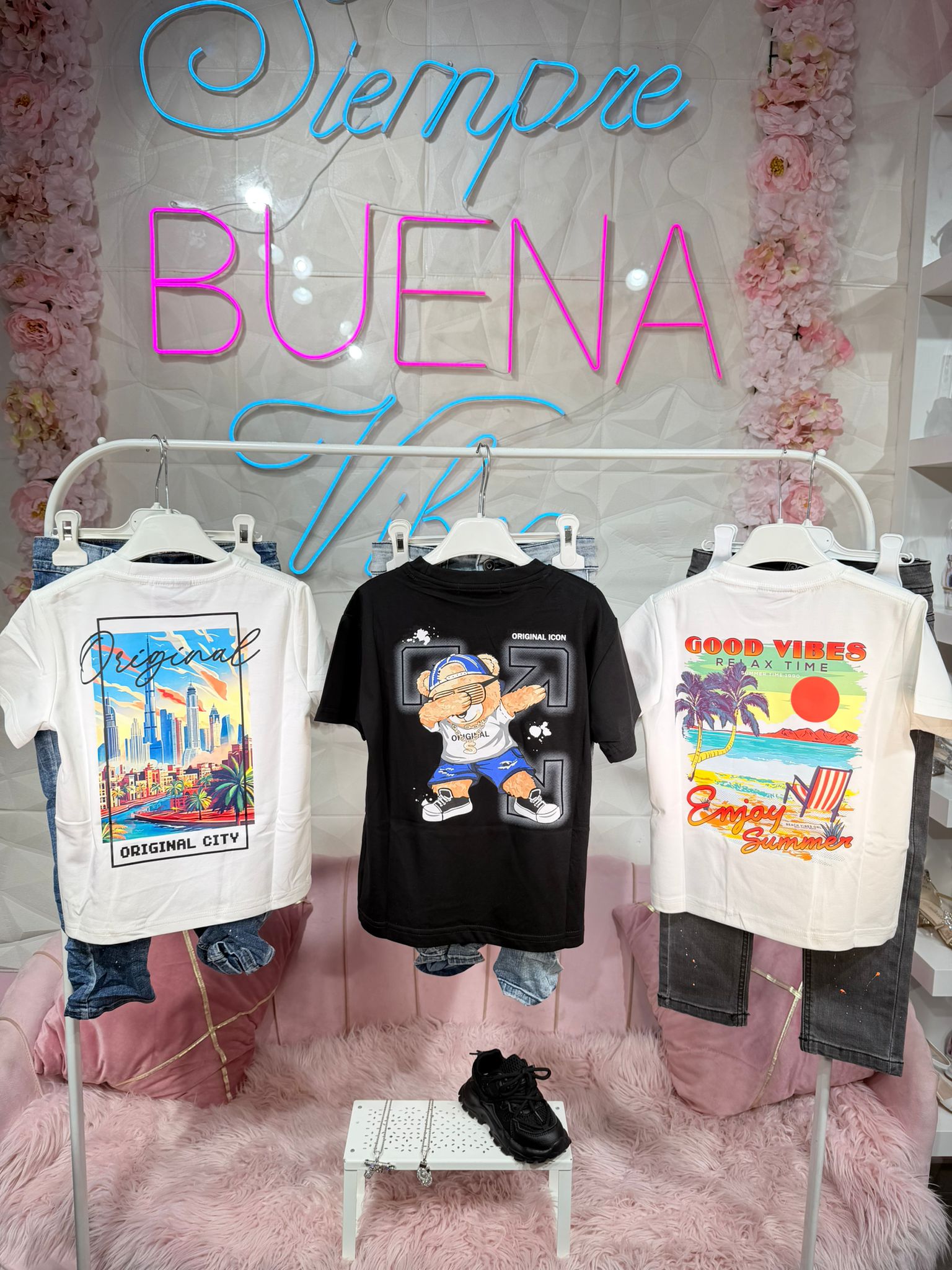 Conjunto compuesto por camiseta y vaquero con cintura engomada.
