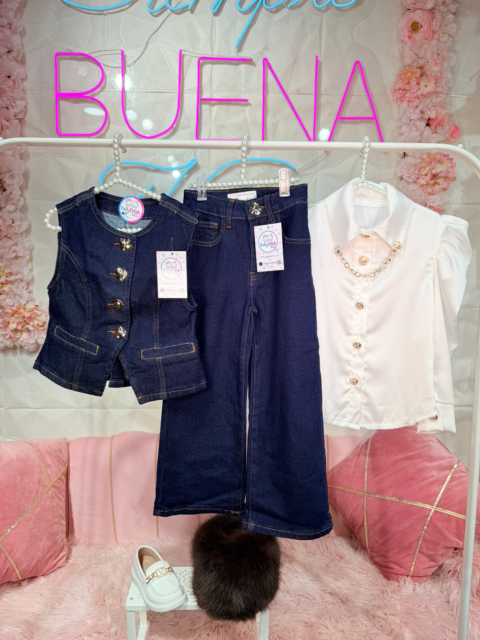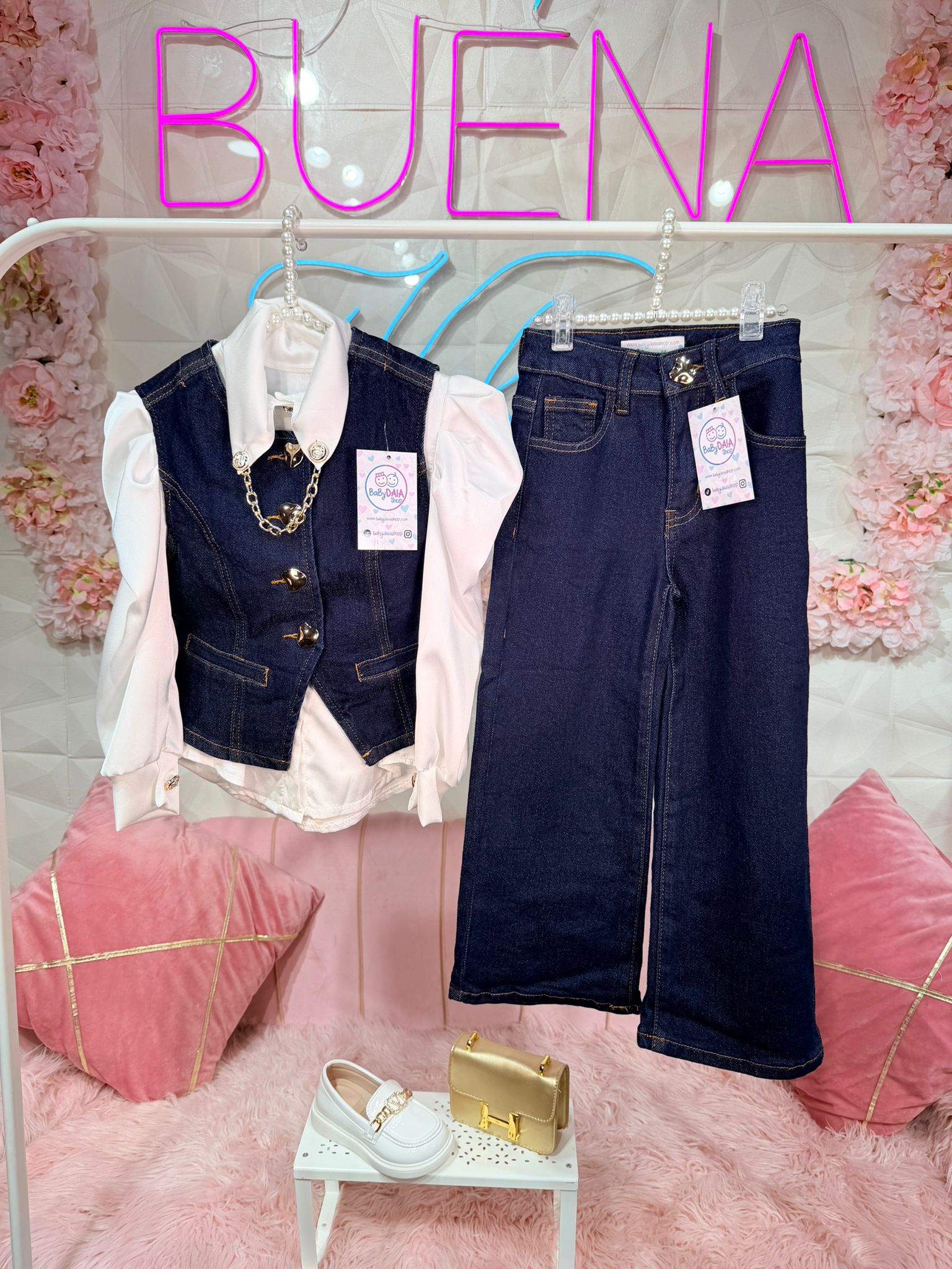 Conjunto compuesto por chaleco + camisa + vaquero con cintura engomada.