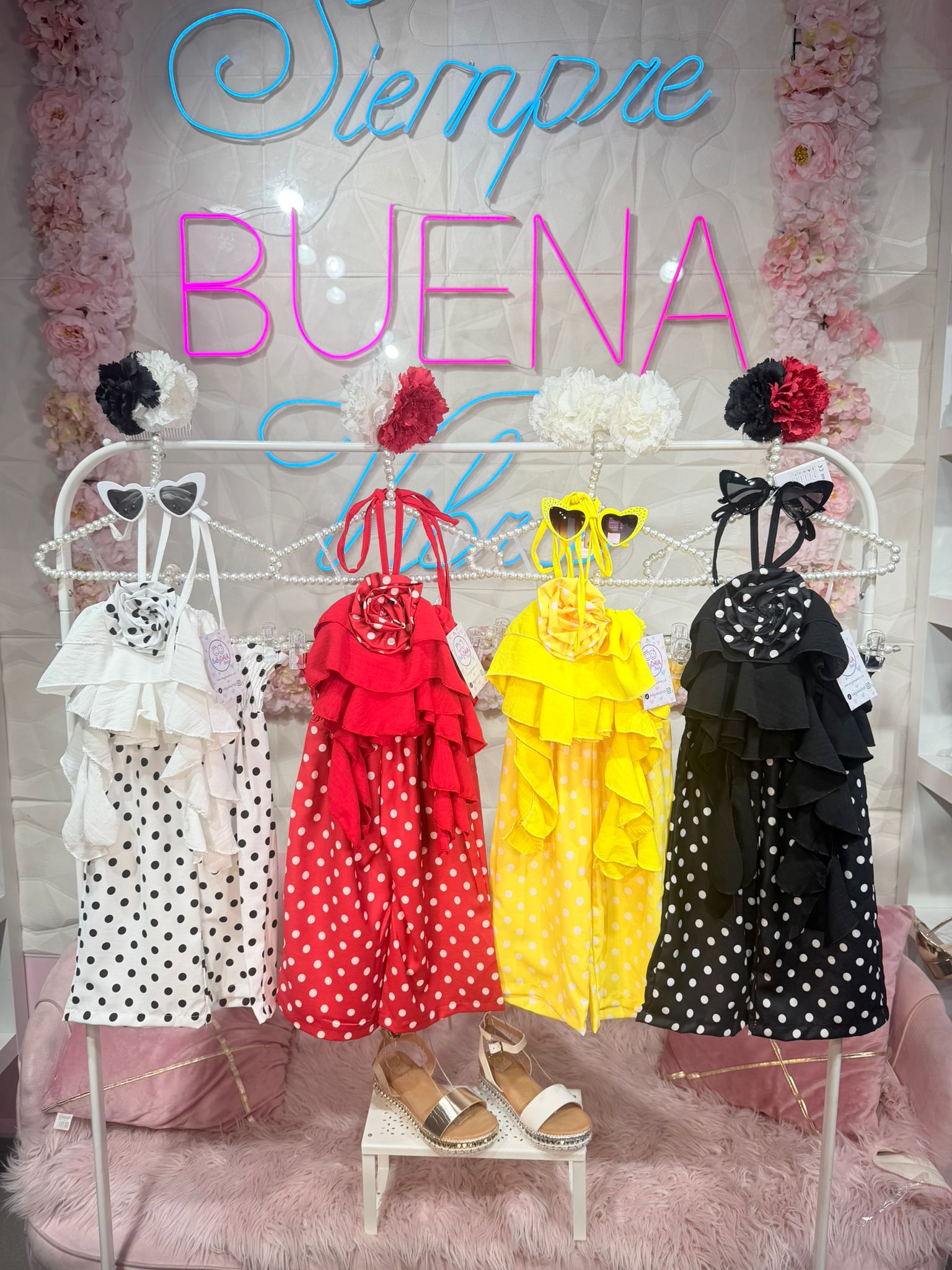 Conjunto compuesto por top atado al cuello y pantalon acampanado con cintura ajustable.