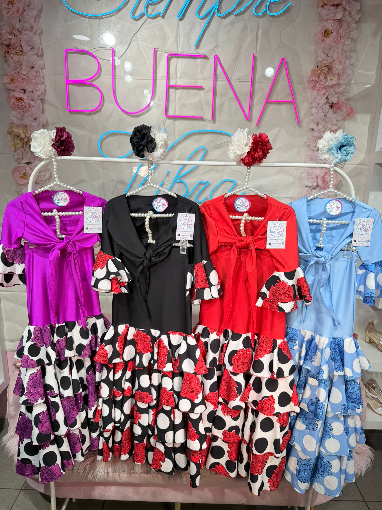 Conjunto compuesto por top y falda con cintura engomada (elástico). Peineta y calzado no incluido.