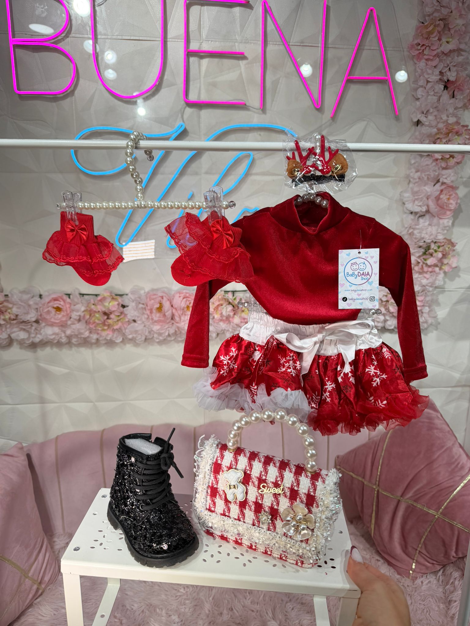 Precioso Conjunto, incluye, jersey, falda, calcetines y lazo de reno a juego.