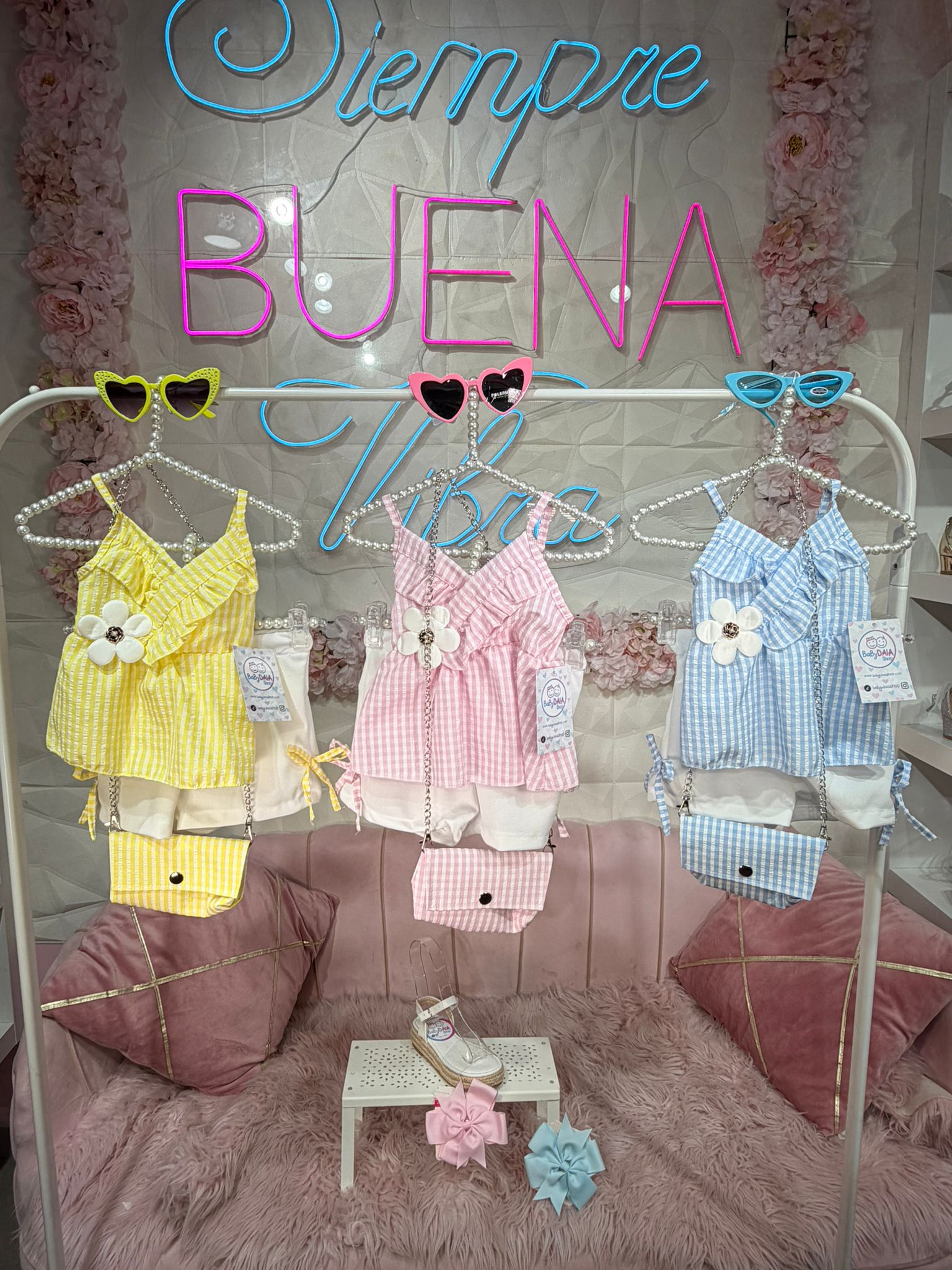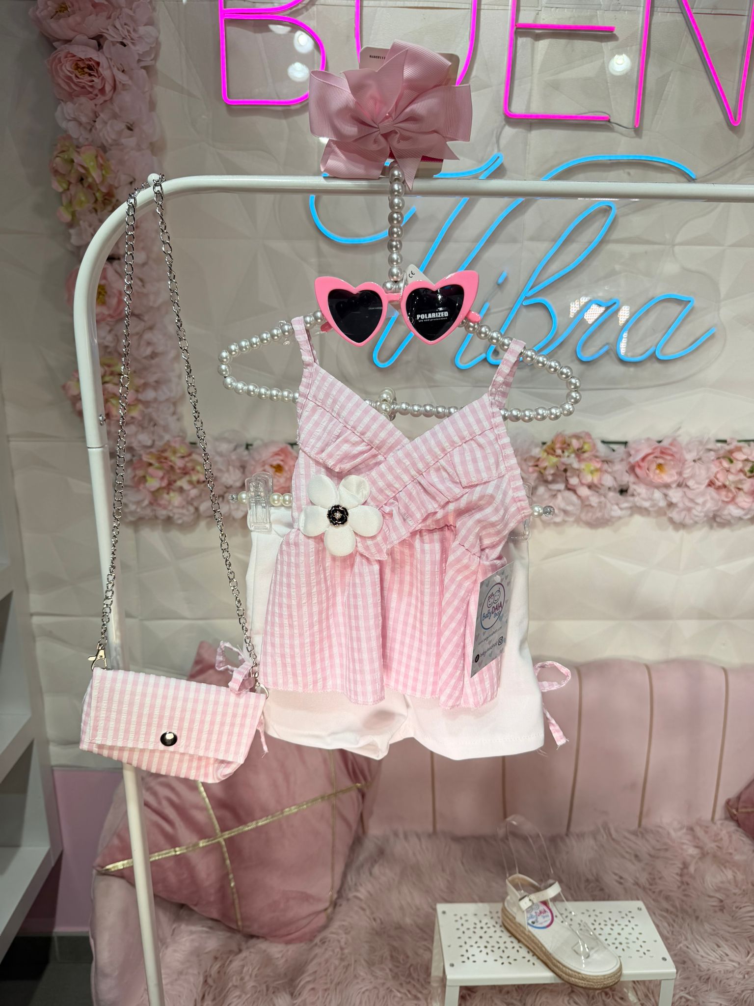 Conjunto compuesto por top de tirantes + short con cintura engomada + bolso