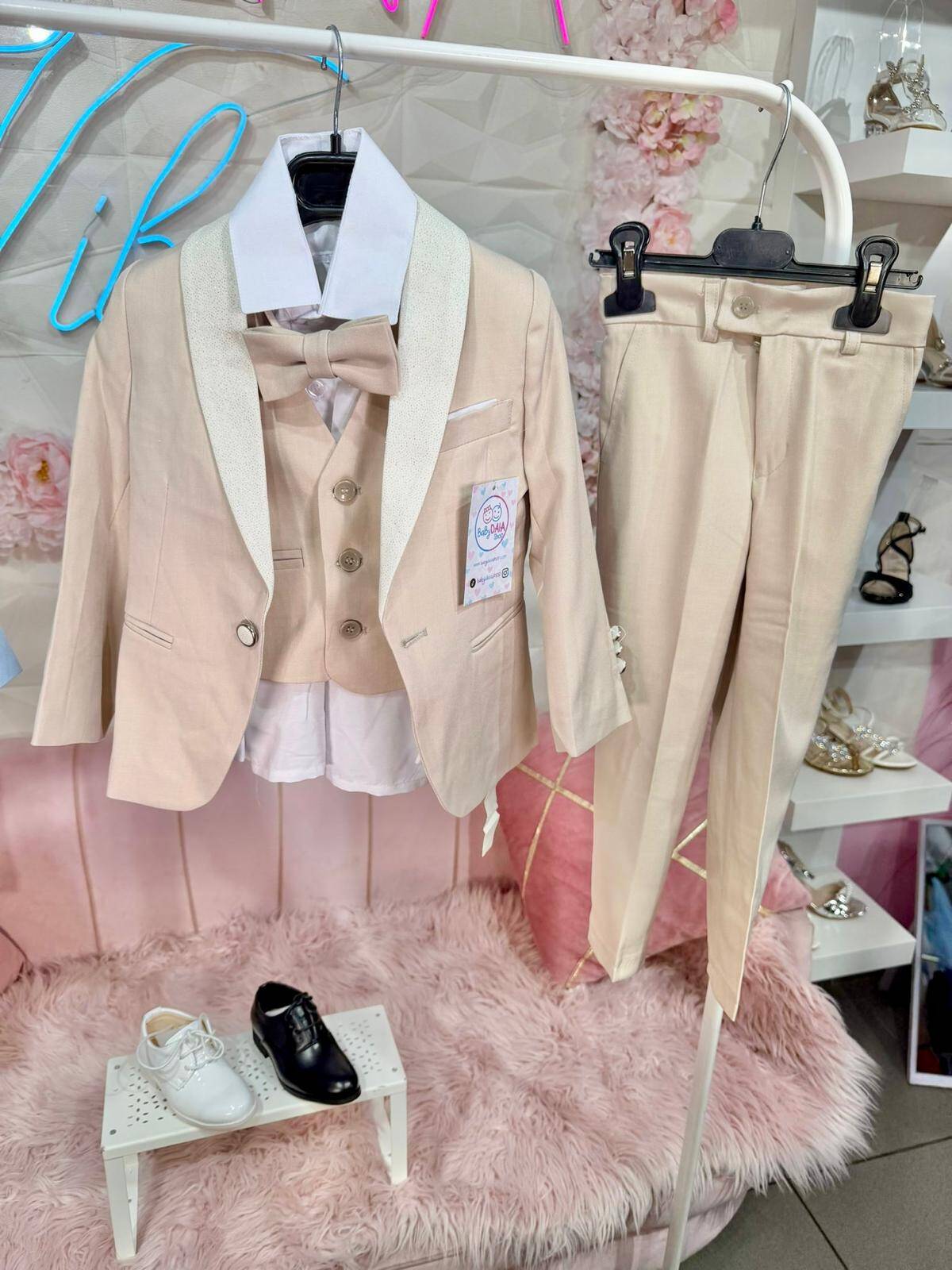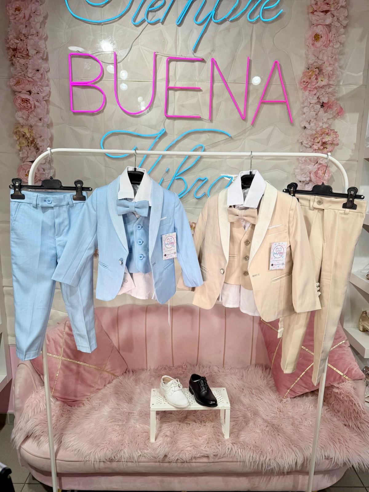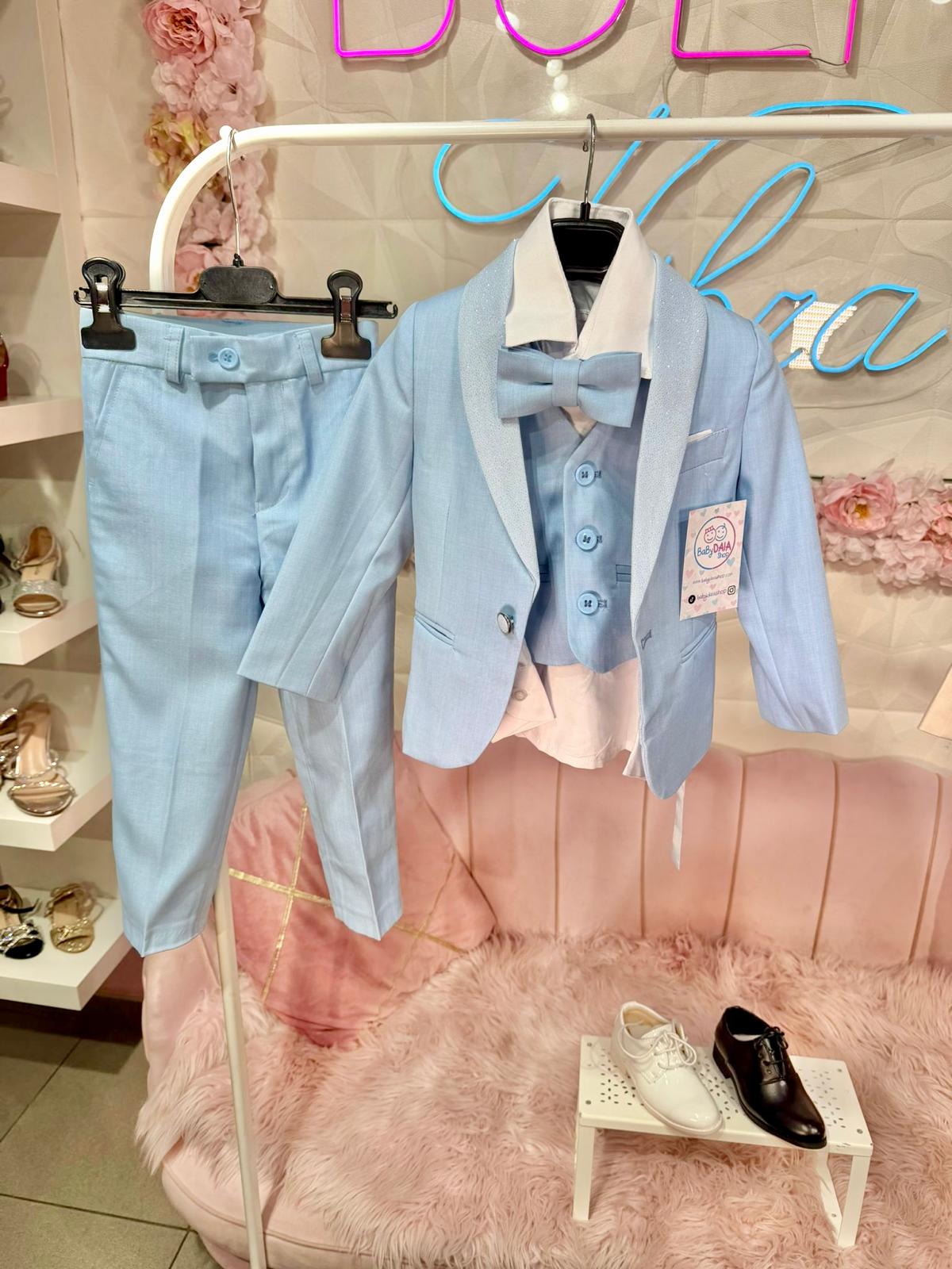 Tallan bien, incluye, pantalon a juego con americana, camisa, chaleco y pajarita.